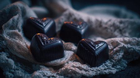 A collection of heart-shaped dark chocolates nestled on a delicate fabric, perfect for romantic themes and special gifting occasions. Add elegance to dessert tables.