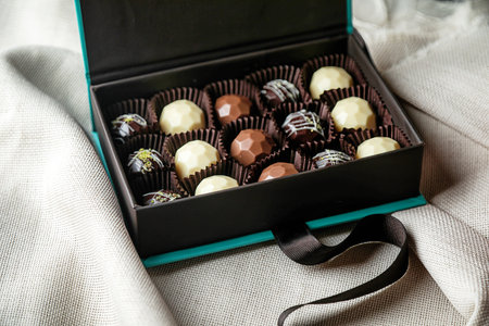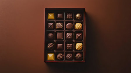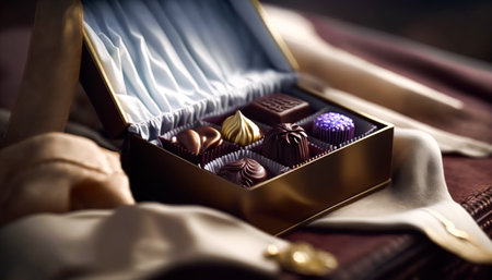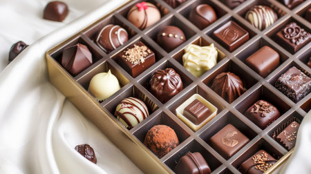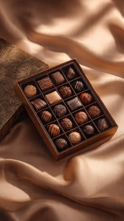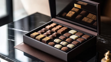A luxurious box of artisanal chocolates, arranged beautifully with intricate designs, set on a textured, elegant surface