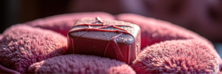 Luxurious chocolate truffle nestled on plush pink velvet cushion. That the image is generated using AI.