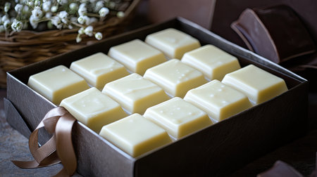 This serene stock photo showcases a neatly arranged box filled with creamy white soap bars, perfect for skincare and wellness themes. Accentuated by natural elements, this image embodies tranquility and elegance, ideal for beauty and gift-related projects.