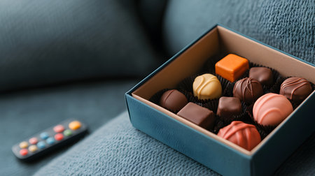 An open blue gift box reveals a tempting assortment of assorted gourmet chocolates, nestled in paper cups. A colorful remote control rests nearby on a textured blue sofa, suggesting a cozy night in.