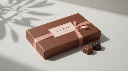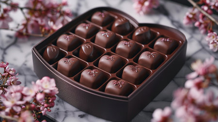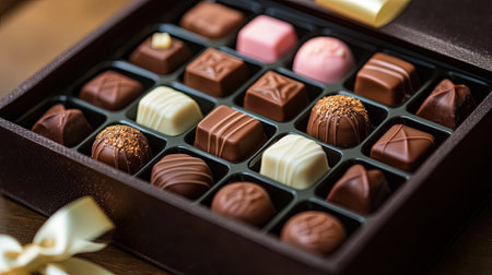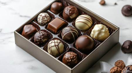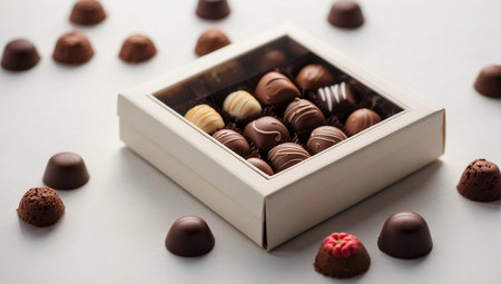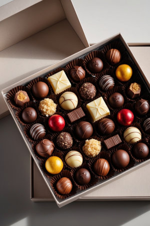 A charming assortment of exquisite chocolates arranged in a stylish box, perfect for gifting on special occasions or enhancing home decor with sweetness.