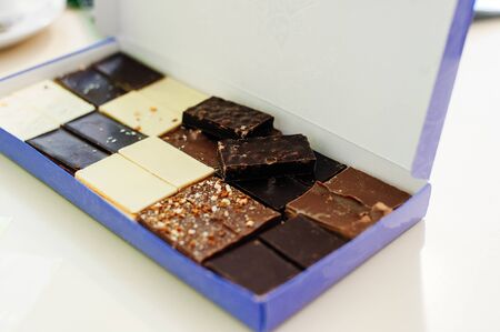 Swiss chocolates in gift box, various luxury pralines made of dark and milk organic chocolate in chocolaterie in Switzerland, sweet dessert food as holiday present and premium confectionery brand