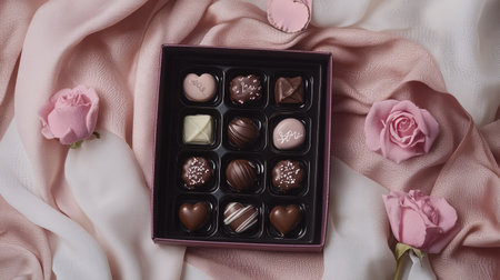 A beautiful Valentine chocolate set with assorted chocolates and pralines, arranged elegantly in a decorative box, placed on a lace tablecloth with soft lighting