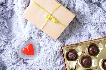 Red heart-shaped candle, candy box and gift box with ribbon on a fur blanket.