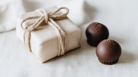This image features a beautifully wrapped gift box tied with natural twine, accompanied by rich chocolate truffles, set on a soft linen fabric background.