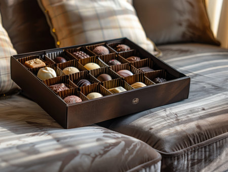 An elegant assortment of chocolates displayed on a plush couch in a cozy living room during afternoon light