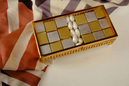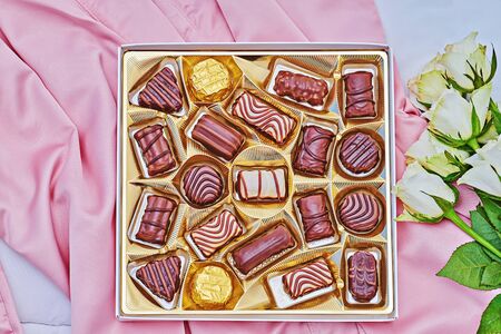Golden gift box of assorted chocolate on pink silk background with white bouquet of rose. Greeting card to celebrate Valentine's Day, Mother day or birthday