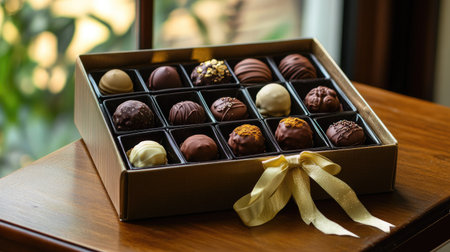 Luxurious gift box filled with assorted truffles and chocolates, placed on a wooden table with a ribbon. Perfect for gifting and special occasions.