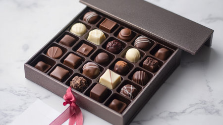 A beautifully arranged box of assorted gourmet chocolates, featuring a variety of flavors and textures. Perfect for gifting or indulging yourself.