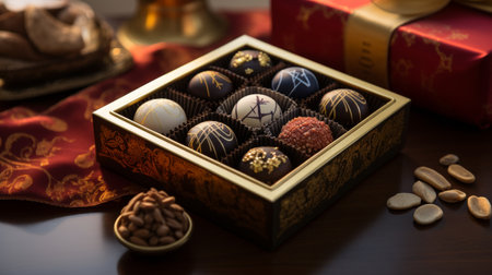 Delight in an assortment of gourmet chocolates nestled in a decorative box, perfect for gifting and celebrating the joy of indulgence during festive occasions.