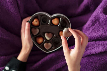 Top view of woman with blanket eating chocolates from heart-shaped gift box