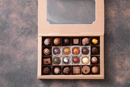 Chocolates and chocolate pralines in a gift box as a luxury holiday present, post-processed, generative ai