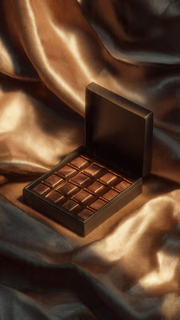 A luxury Valentine chocolate box with a metallic finish, positioned on a plush velvet surface with soft ambient lighting.