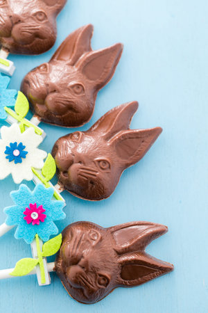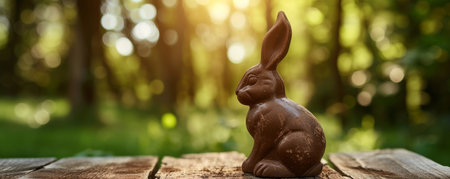 Easter chocolate bunny concept for greeting card or festive banner, copy space for a text