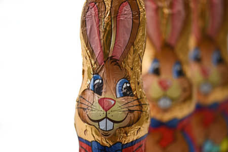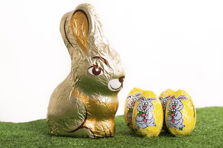 Photo of a tinfoil covered chocolate easter bunny isolated on white