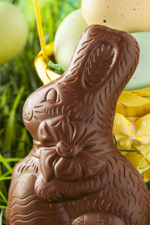 Chocolate Easter bynny with chocolate Easter candies on stand.