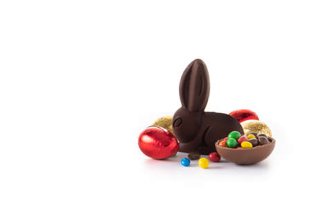 Chocolate Easter bunny and eggs with candies on white background. Space for text