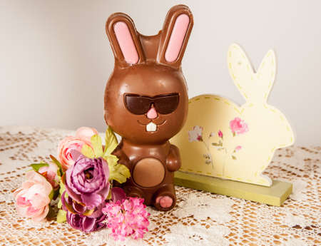 Cute chocolate Easter Bunny with flower decorations in studio.