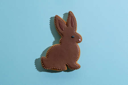 Easter bunny bakery. Festive pastry. Traditional holiday gift. Pretty rabbit gingerbread figure with chocolate icing decoration isolated on blue textured copy space.