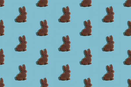 Chocolate Easter Bunny on blue background pattern, flat lay