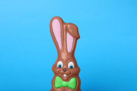 Chocolate Easter bunny and sprinkles on light blue background. Space for text