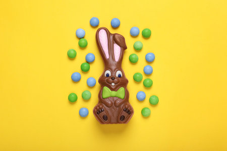Chocolate Easter bunny and candies on yellow background, flat lay
