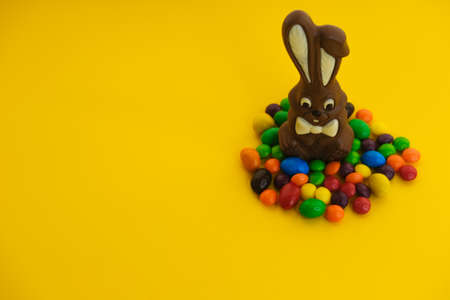 Chocolate Easter bunny lies with multi-colored sweets on a yellow background, close-up.