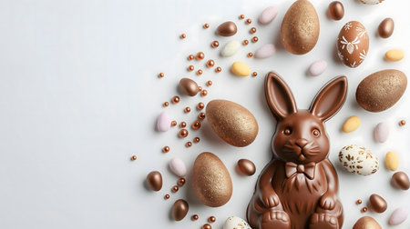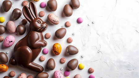 A chocolate bunny surrounded by chocolate eggs and candies. Perfect for Easter celebrations!