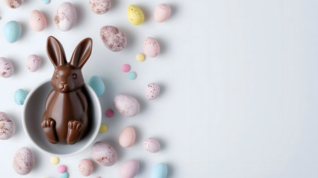 A delightful Easter scene featuring a chocolate bunny surrounded by pastel eggs and candies.