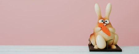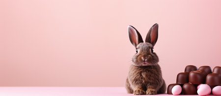 a chocolate bunny as a spanish mona de pascua, a traditional confection given by godparents to godchild on easter, on a table against a pink background, in a panoramic web banner format