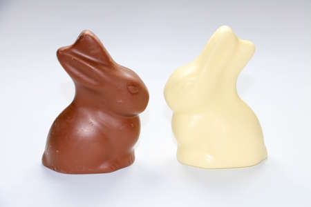 Two chocolate Easter bunnies, one standing and one sitting, on a white background.