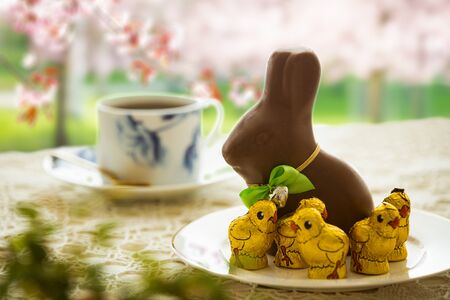Beautiful served small table with Easter decorations on outdoor terrace. Little chocolate bunny with bow, chocolate eggs, cup of coffee, crystal bowl. Spring holiday setting. Close-up