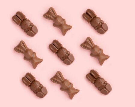 Easter bunny shaped sweets of milk chocolate laying in rows on pink background.Religious holiday composition,rabbit pattern for congratulations in greeting card.Symbol of celebration Sunday of Christ.