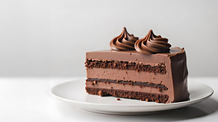 Aerial view of a rich and creamy chocolate cake slice, with a soft-focus background offering ample space for text. -
