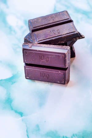 Ounce of ten grams of dark chocolate, on a background of blue marble.