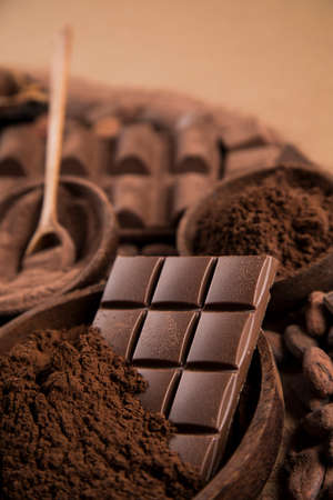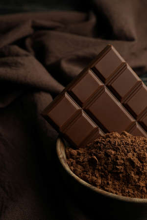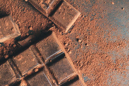 Brown cocoa powder in the spoon on chocolate bar, chopped chocolate cubes on dark background with copy space.