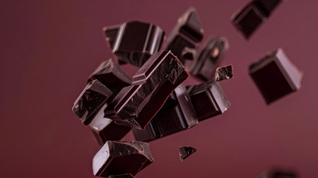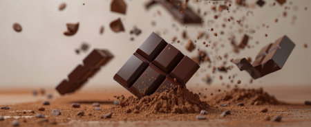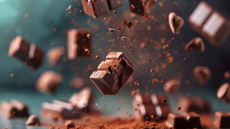 Dynamic shot of chocolate pieces flying in the air with cocoa powder, creating a sense of motion and indulgence.