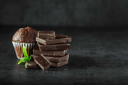 Chocolate cupcake with icing and chocolate bar in Dark lighting, Homemade delicious chocolate muffin on wooden background close-up