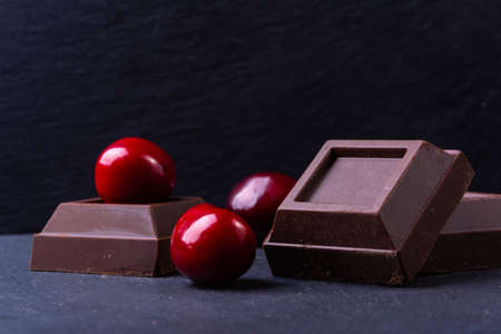 A few pieces of milk chocolate on dark background with copy space, close-up, top view.