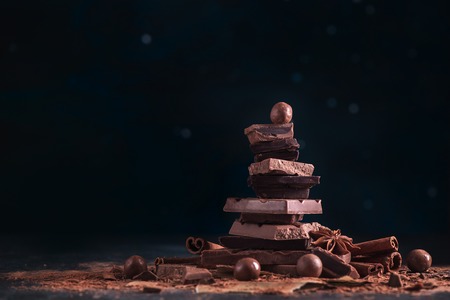 Stack of broken chocolate pieces on a dark background with copy space. Confectionery food photography in low key.