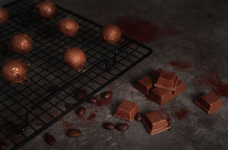Dark chocolate truffle background in low key. Dark and moody background for your design. Delicious food concept.