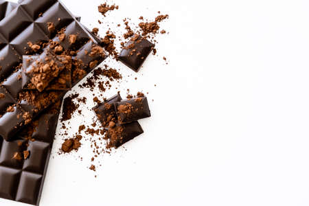 Broken chocolate bar on the white background with copy space. Scattered chocolate pieces.