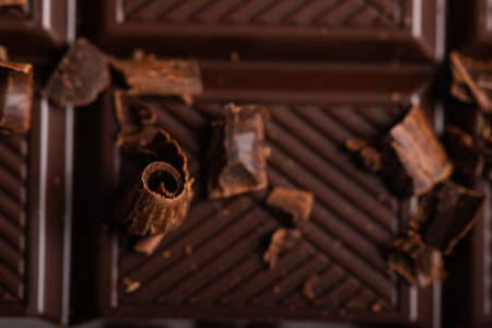 Broken chocolate bar chips and powder. Shallow depth of field.