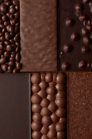 Variety of chocolate bars. Heap of dark, milk, pink chocolate and chocolate with fruits and nuts. Sweet food background.