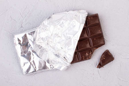Chocolate wrapped in foil. Chocolate bar wrapped in silver foil. Sweets in chocolate shop.