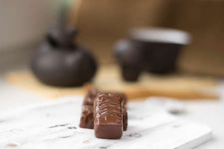 Bars Chocolate , candy sweet, dessert food on wooden background