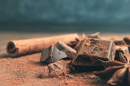 Chopped chocolate cubes with cocoa powder and star anise on dark background with copy space, close-up view.