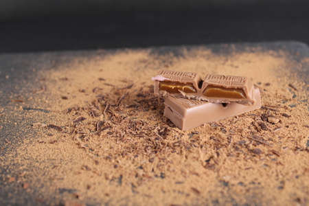 A cut of chocolate stuffed with caramel chocolate bar lies on the cocoa on a black background and a copy of the day of chocolate.