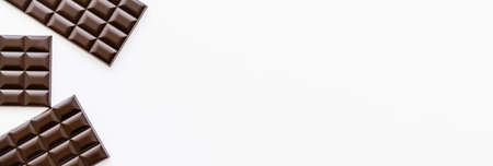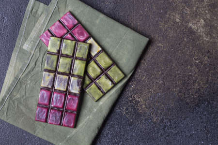 Tasty chocolate bars on dark background. View from above. Chocolate background.